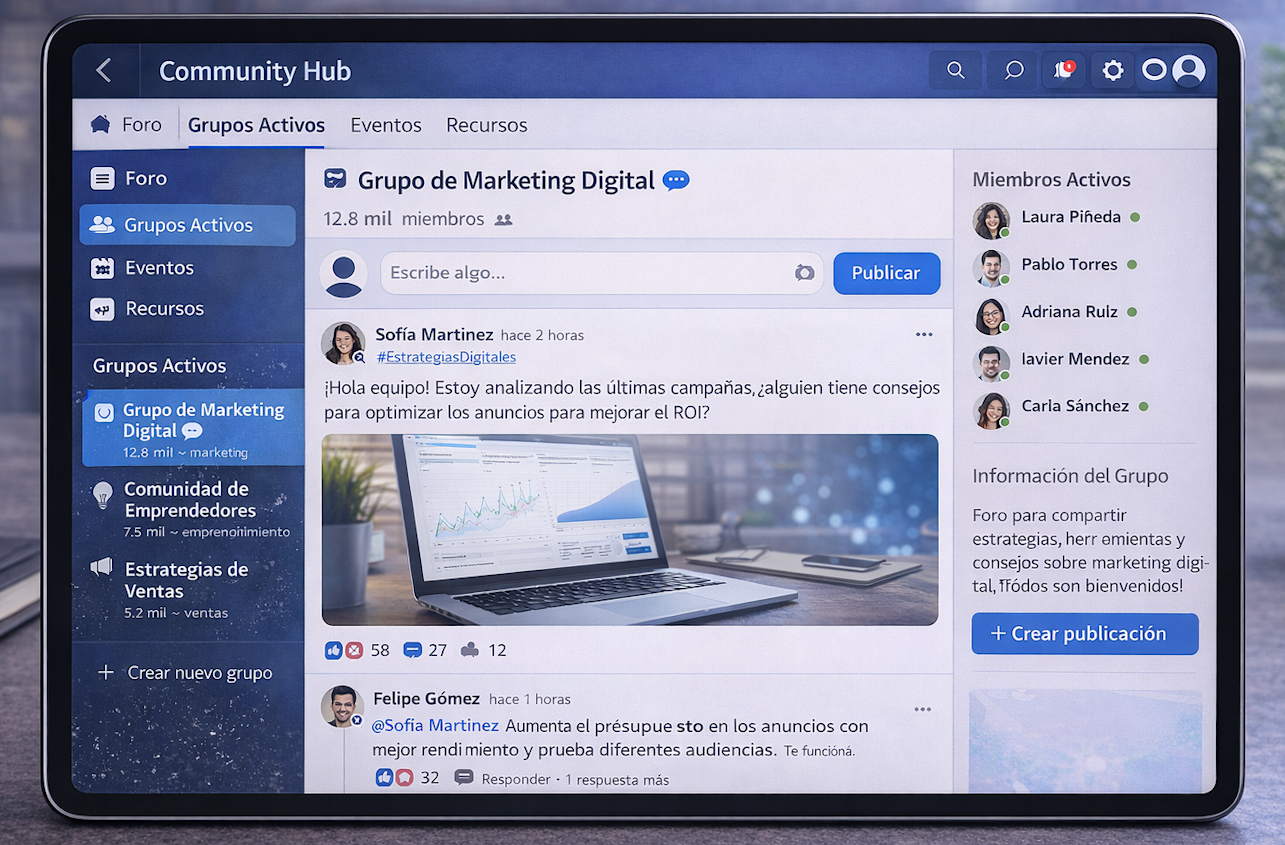 Acceso a recursos, soporte estratégico y comunidad enfocada en el crecimiento y escalamiento de negocios digitales.